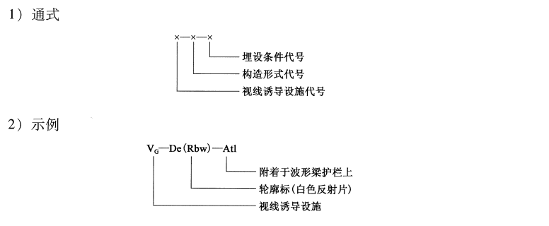 一、 设置于公路路基上的波形护栏标准段设计代号由护栏构造形式代号、防护等级代号、埋设条件代号三部分组成。各种代号规定如下: