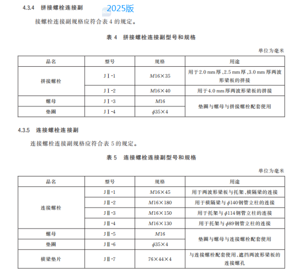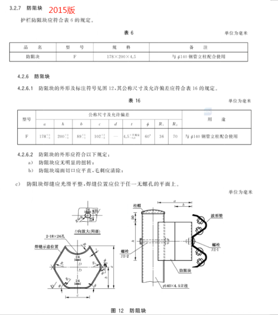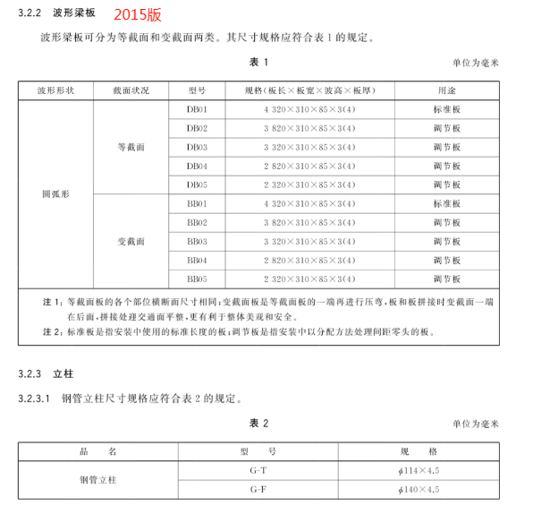 c) 更 改 了 两 波 形 梁 板 、钢 管 立 柱 的 用 途 、型 号 和 规 格(见 4.3.1、4.3.2,2015 年 版 的 3.2.2、3.2.3.1);