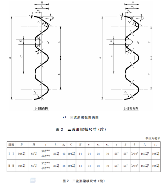 m) 增加了三波形梁板中部连接螺孔数量应根据钢管立柱间距设置的要求、展开尺寸及允许偏差的要求(见5.2.1.1~5.2.1.3);